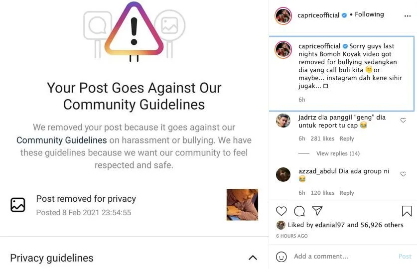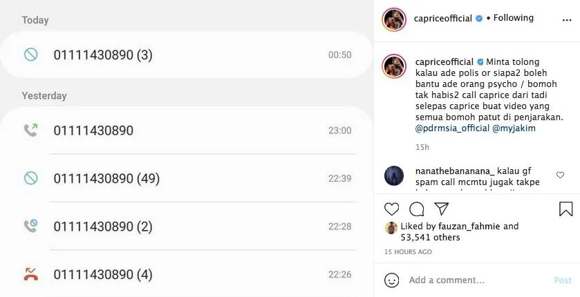 Caprice later posted a screenshot of the culprit’s number online. “If there is any police officer or anyone who can help. There’s a psychotic shaman here. He hasn’t stopped calling me after I posted my previously video,” he wrote on the post.