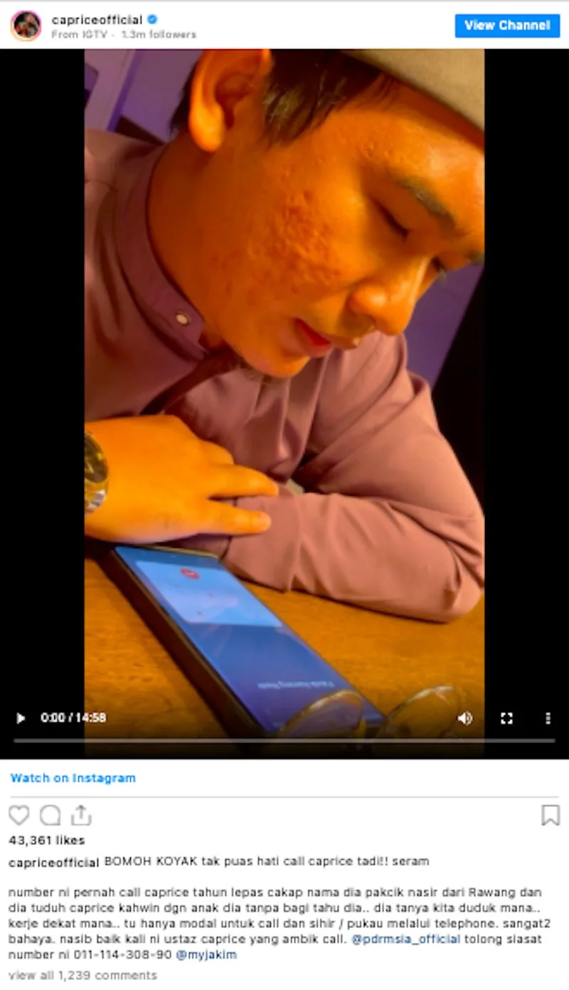 In the video, the rapper revealed that he was interrupted by many phone calls from shamans, who were unhappy with his action. Caprice also shared with his followers a clip of an ustaz answering a phone call on his behalf.