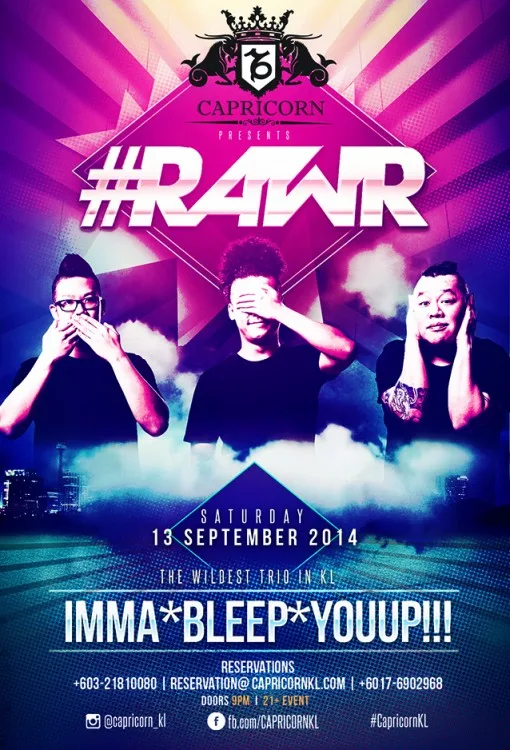Known for their creative ways of blending comical antics with their sound, producing some really good vibes and tunes, Imma*Bleep*YouUp will be playing at Capricorn KL this September 13th (Saturday). Inspired and influenced by DJs such as Dada Life, Swanky Tunes, Avicii, Tommy Trash and more, join Kuala Lumpur’s wildest trio in having a fun filled night this weekend!