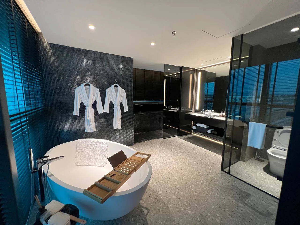 The bathroom area was an unexpected highlight. Bathrooms are typically compact, but not this one. It features a large tub with complimentary bath salts, dual sinks, and ample space to move about.
