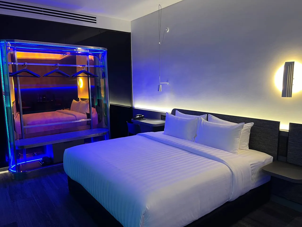 There is only one king-size bed, but the space can supposedly accommodate up to four adults. A bar island with a mini fridge offers complimentary drinks. We love how the blue built-in strip lights in the wardrobe look futuristic, giving the room an edgy style. This feature not only complements the exterior décor but also fits seamlessly with the overall MAX theme.