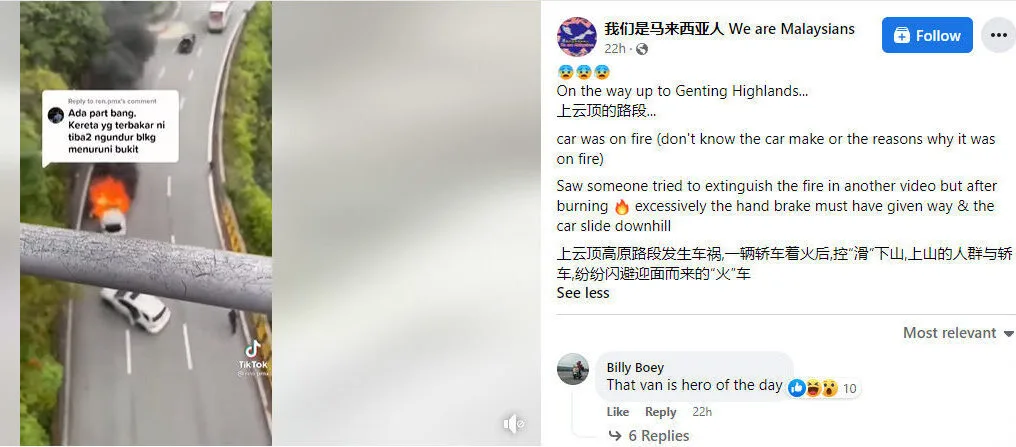 The family of five who had been in the fiery car, managed to get out safely. Facebook group 我们是马来西亚人 We are Malaysians claims that someone had been attempting to extinguish the fire before it started rolling backwards. However, it is suspected that the hand brake had given way, leading to it rolling downhill.