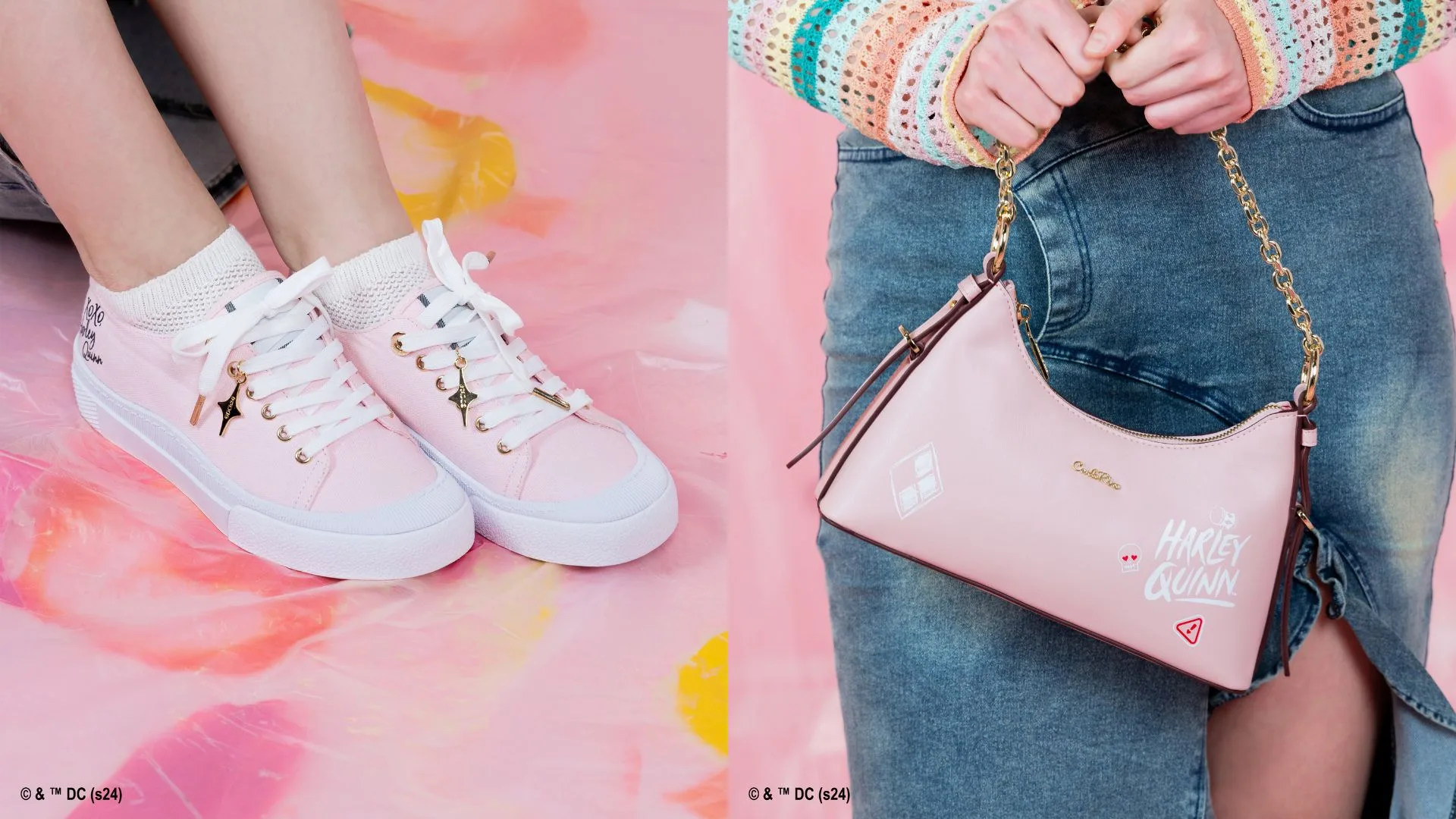 For versatility and edge, the Harley Quinn 2-Way Crossbody & Shoulder Bag showcases graffiti-inspired motifs that bring Harley’s rebellious spirit to life. This bag combines stylish design with practicality, making it perfect for those who value both fashion and function. Complementing your look, the Harley Quinn Canvas Sneakers offer a playful yet sophisticated choice, featuring pink canvas, a gold-tone charm, and unique stitching for comfort and style.