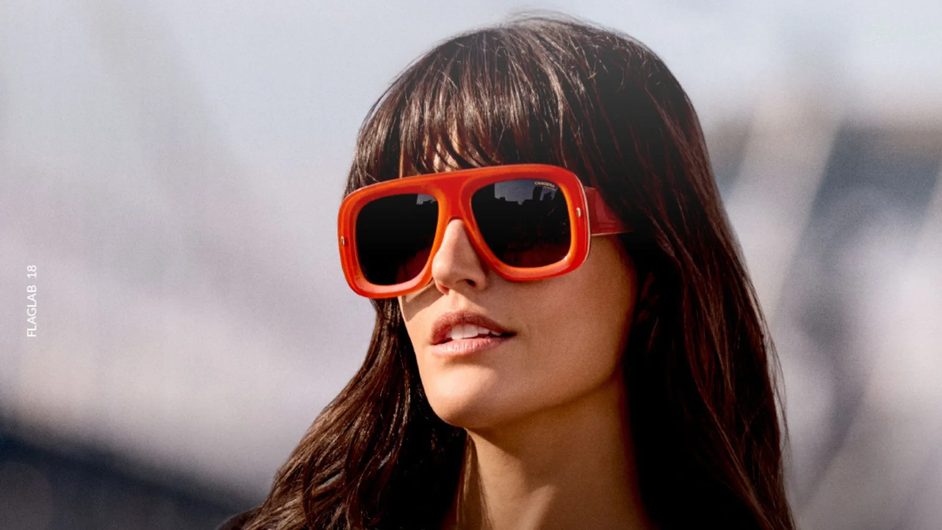 The new sunglasses and optical frames are branded by the Carrera flag metal detail and crafted in acetate or multi-layer acetate, referencing the colours of the iconic Carrera flag.