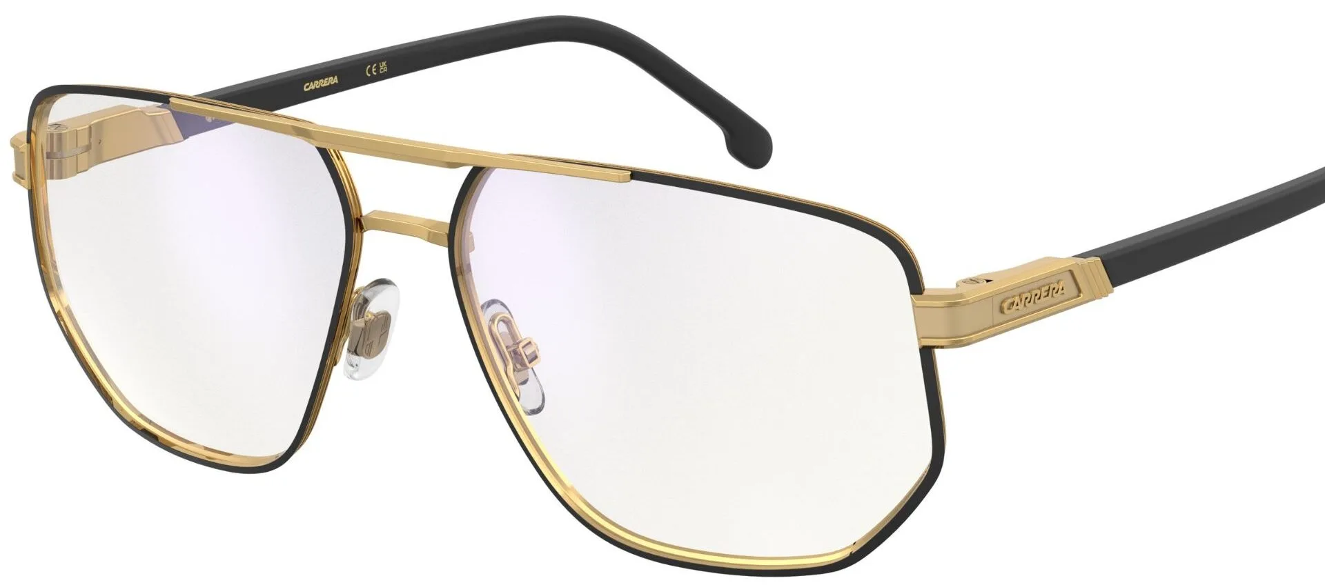 Angular optical frame in lightweight stainless steel with metal and acetate temples, provided with comfortable flex hinges on the temples and branded with the “CARRERA” logo enriching the distinctive temples, as a signature detail celebrating the brand’s heritage. A made-in-Italy masterpiece. Colour palette: black/gold, gold/blue, gold/black, ruthenium/black.