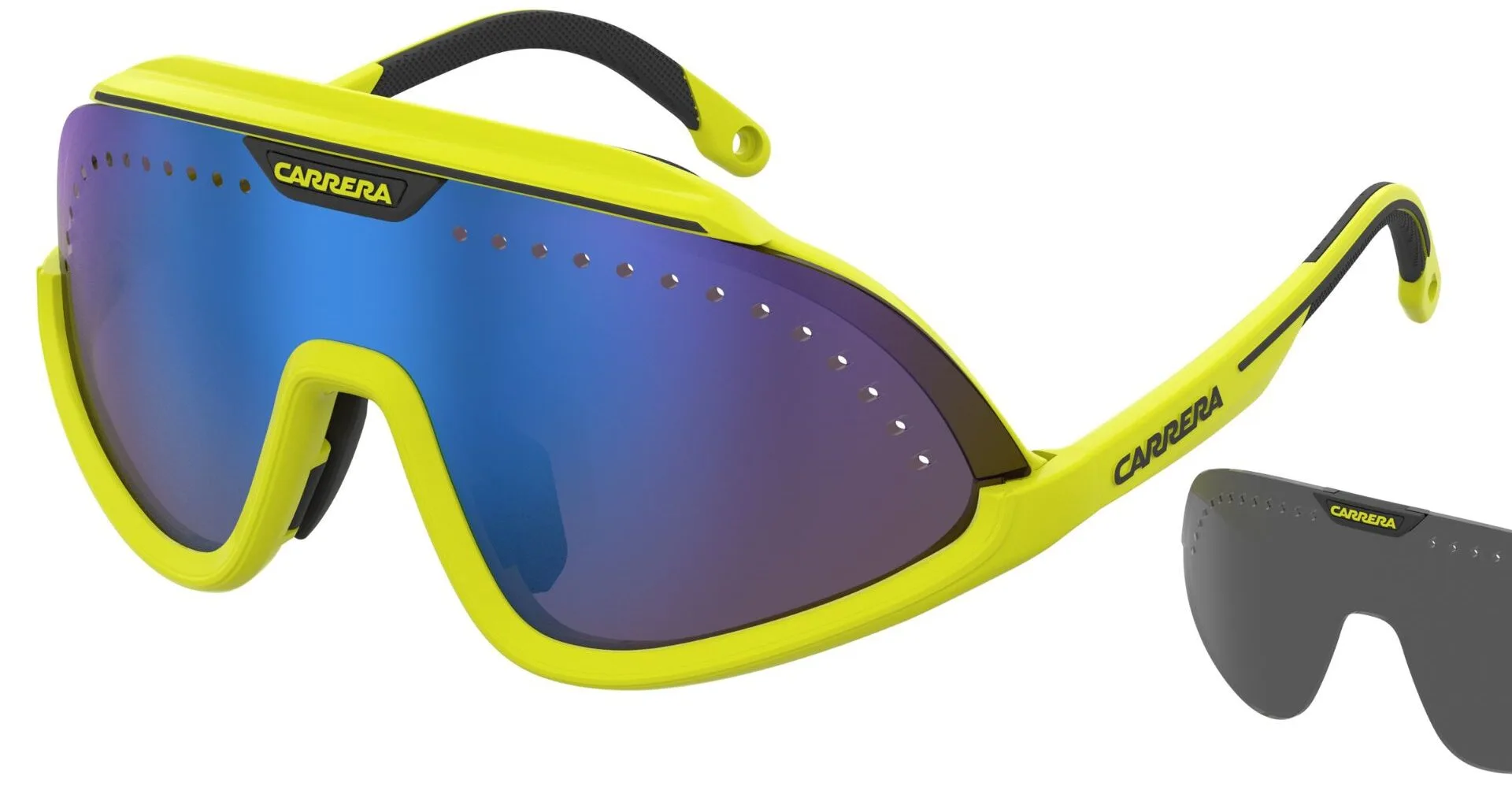 Inspired by the original Carrera Sport iconic shapes, this oversize and wraparound mask reinterprets one of the outstanding Carrera archive masterpieces.