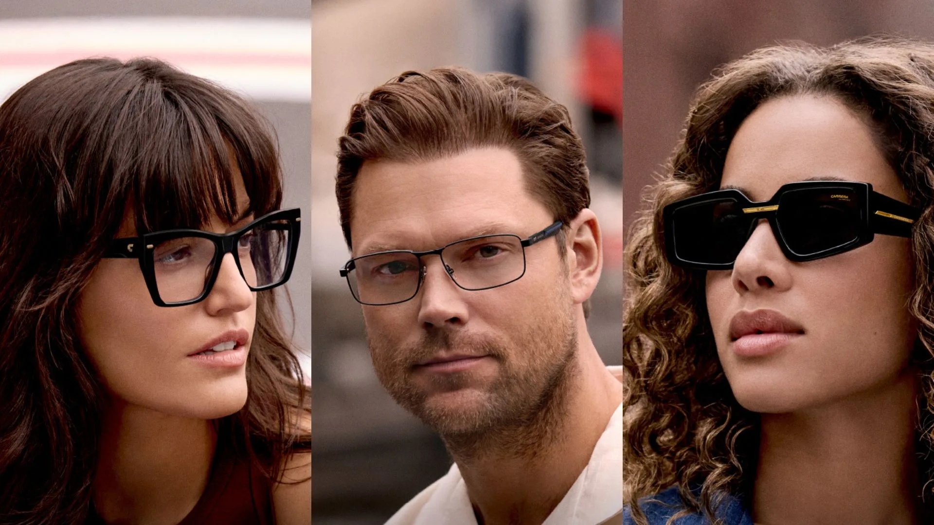 The new sunglasses and optical frames are branded by the Carrera flag metal detail and crafted in acetate or multi-layer acetate, referencing the colours of the iconic Carrera flag.