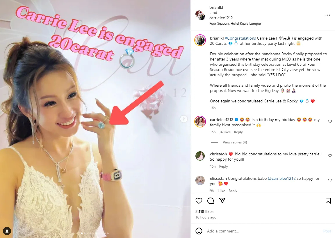 Wedding bells are ringing for Carrie Lee, much to the delight of her family and friends, after her boyfriend Rocky, proposed to her yesterday (15th December) during her birthday celebration. The joint celebration made her very happy, and we can see why, especially after we got a glimpse of her 20-carat diamond ring!