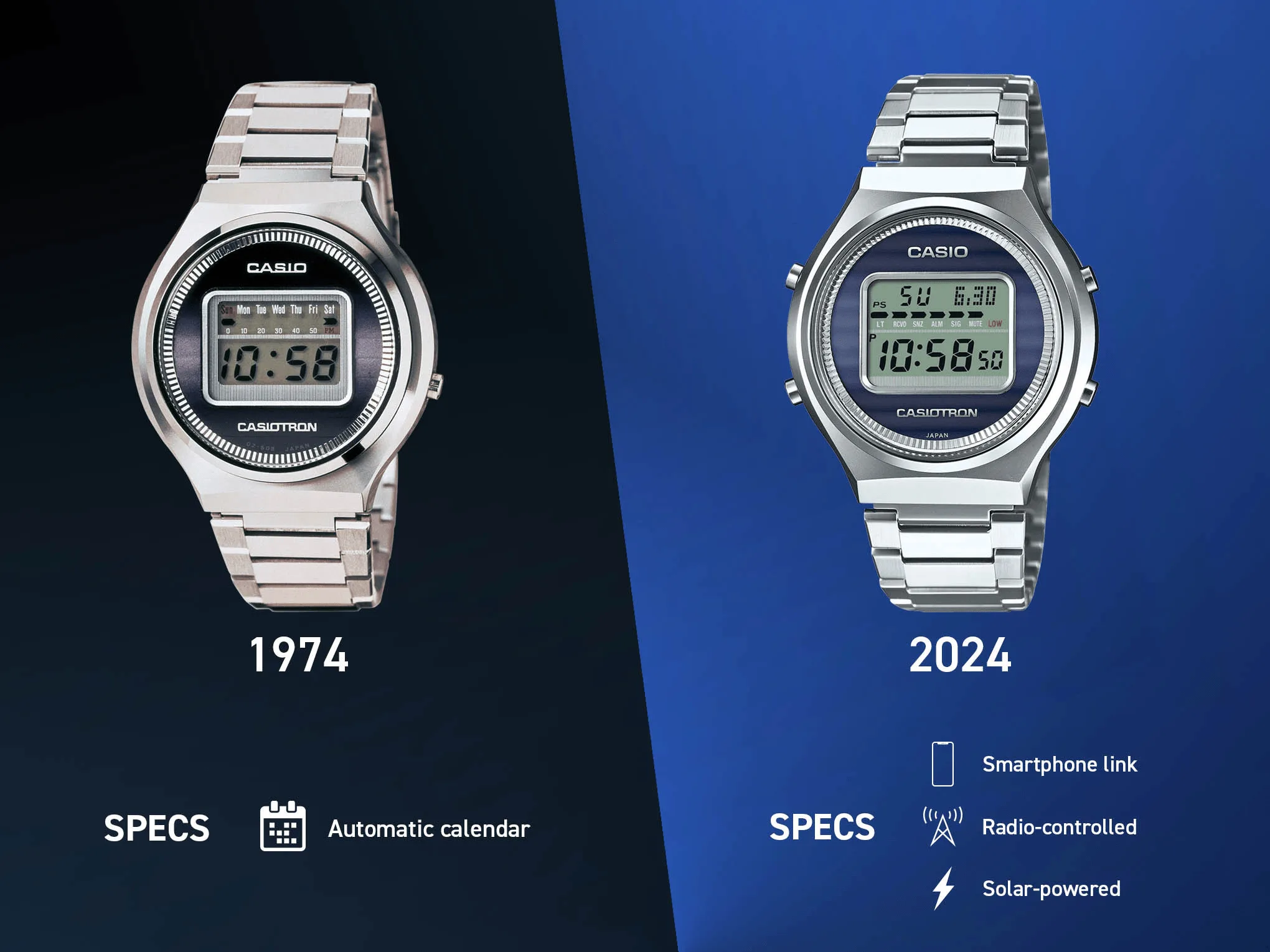 Casio originally released the Casiotron in 1974, breaking ground with a digital wristwatch inspired by the insight that “watches simply add up seconds.” The watch made the most of the original digital technologies Casio had developed in its calculator business, bringing the concept of a fully automatic wristwatch to life.