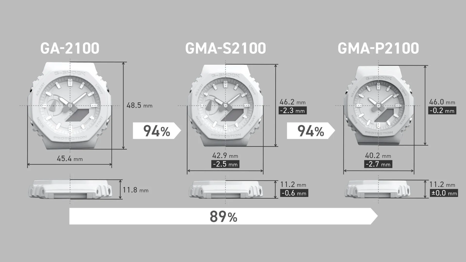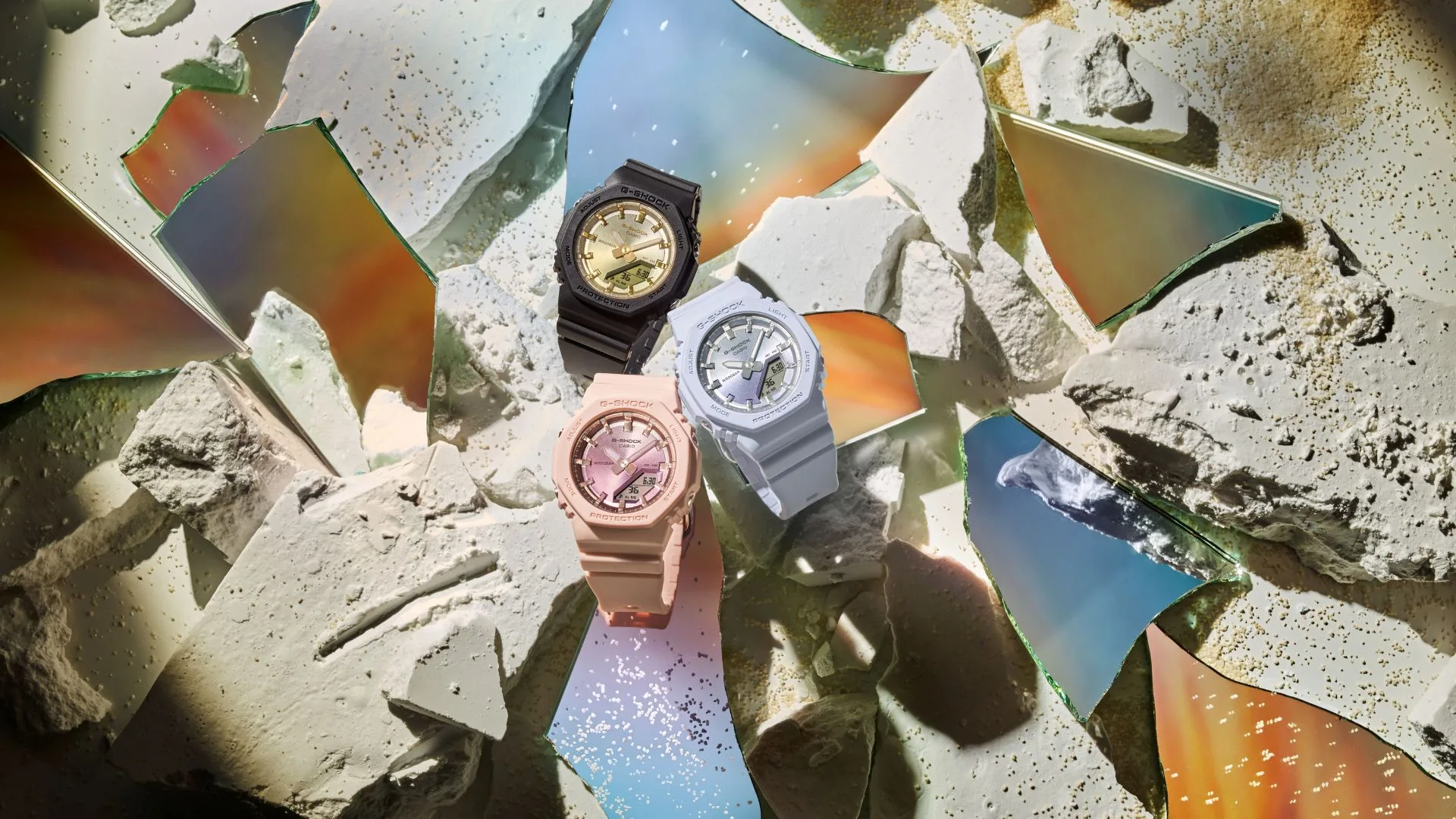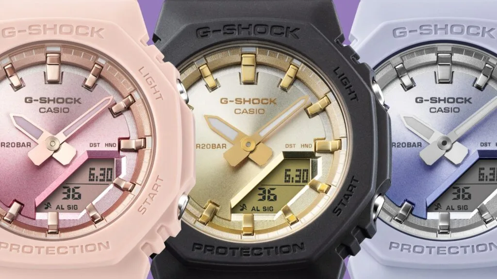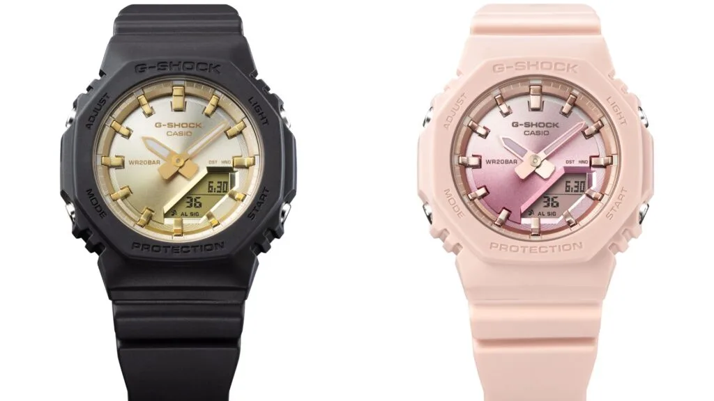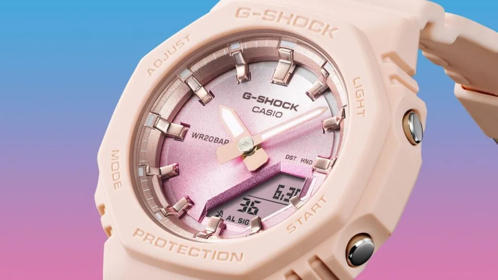 The GMA-P2100SG-1A and GMA-P2100SG-4A evoke the gorgeous sight of a beach at sunset. The beautiful glitter of the summer sun setting over the water is represented by vapour deposition in a lustrous gradation of colour on the dial. These watches are based on the GMA-P2100, which is a smaller version of the popular GMA-S2100 analogue-digital combination timepiece.