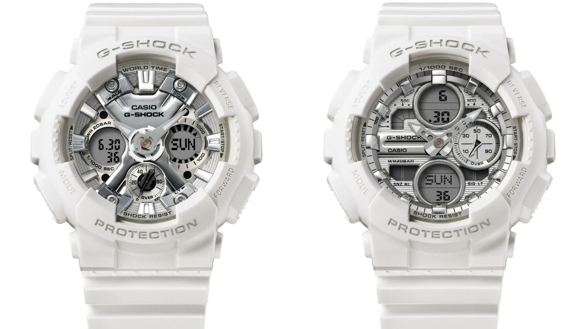 The GMA-S120VA-7A and GMA-S140VA-7A are based on the GMA-S120 and GMA-S140, respectively, which are more compact versions of ever-popular analogue-digital combination timepieces. Clad only in white, the dials and hour markers have been finished with silver vapour deposition, creating a dazzling and elegant vibe that also goes well with silvery accessories. These are great timepieces to finish a breezy summer or beach resort look.
