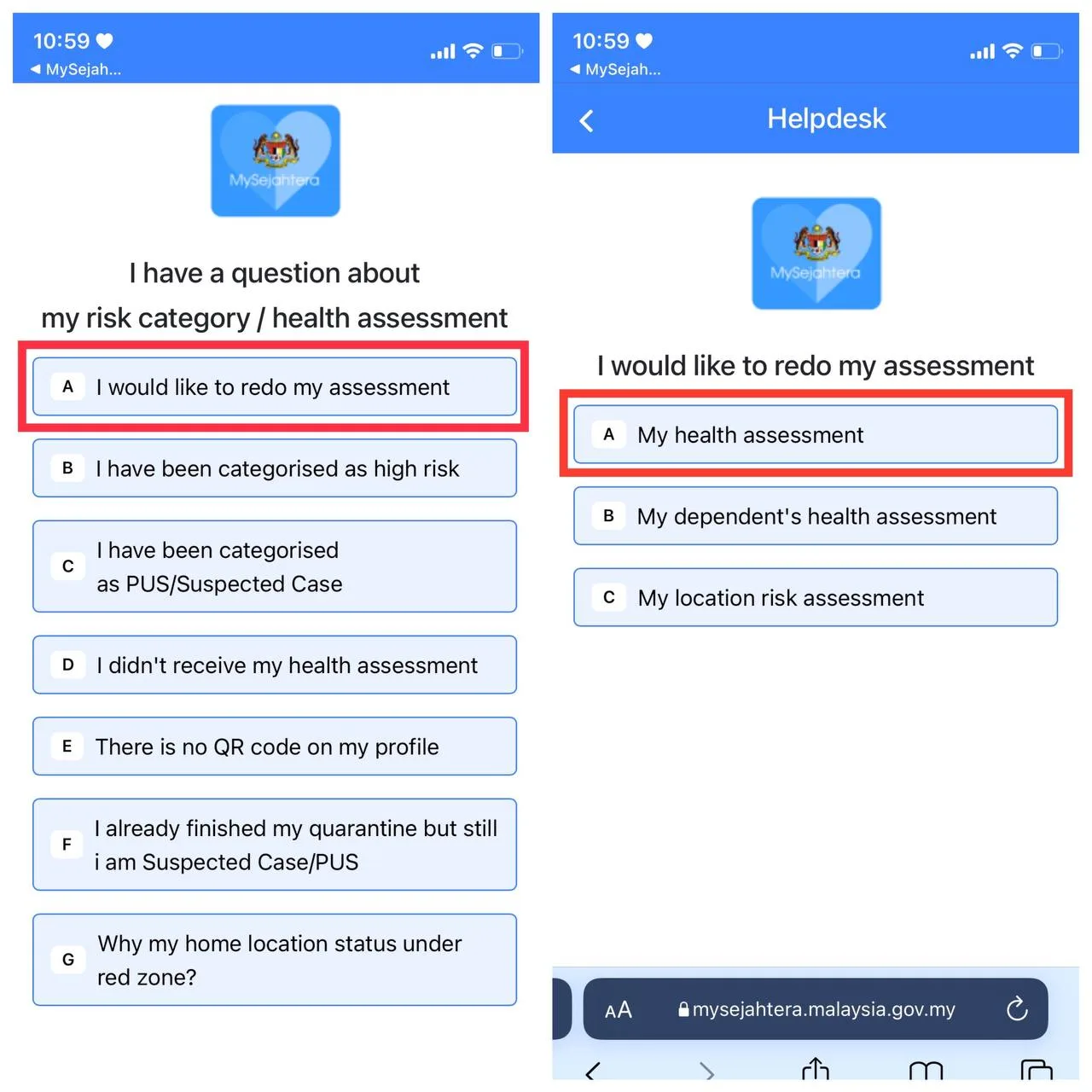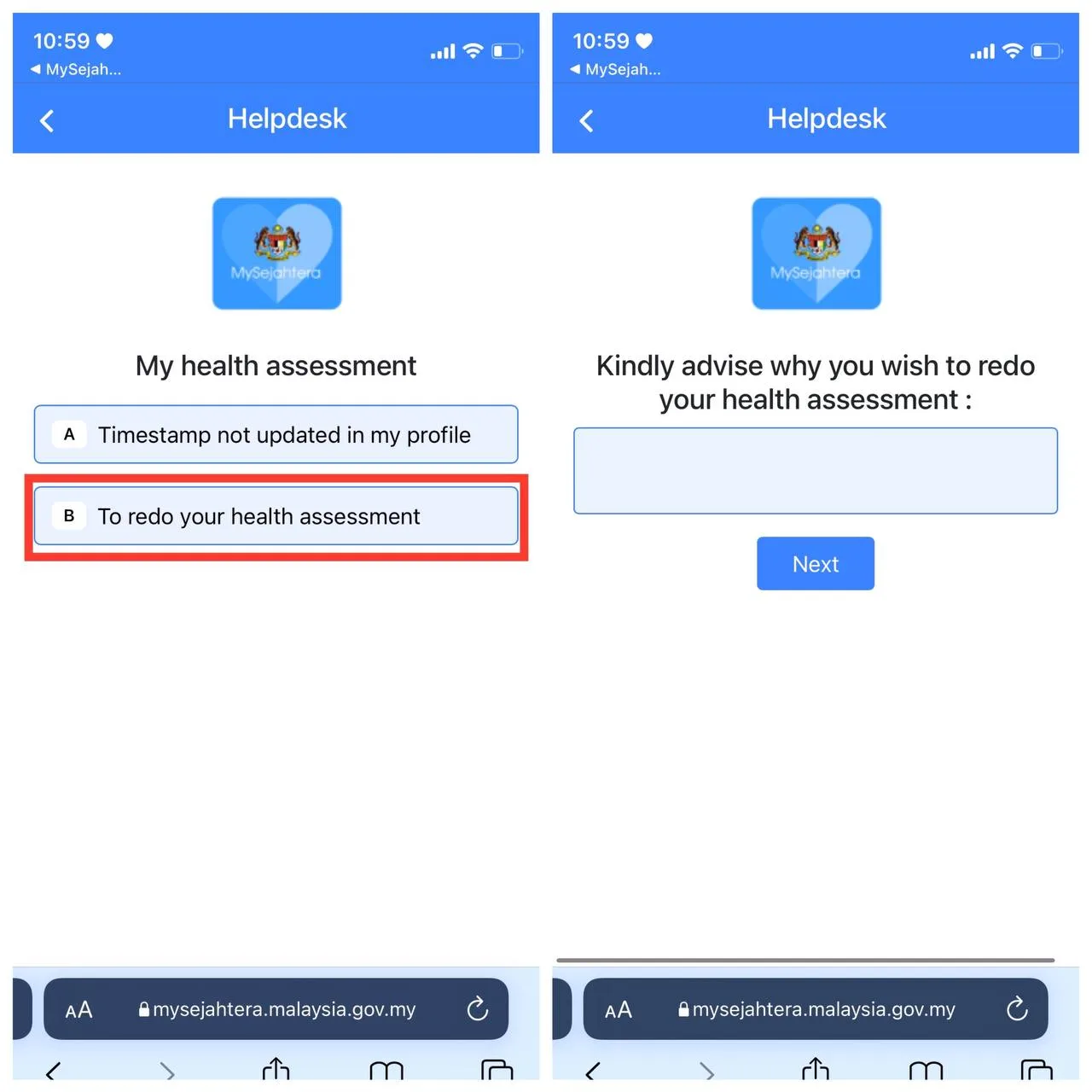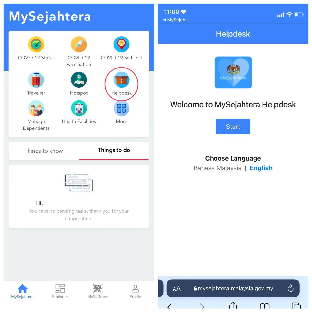 - Find the helpdesk option on the homepage of your MySejahtera, and select it, then click “Start”. (It’s the brown desk icon on the right)