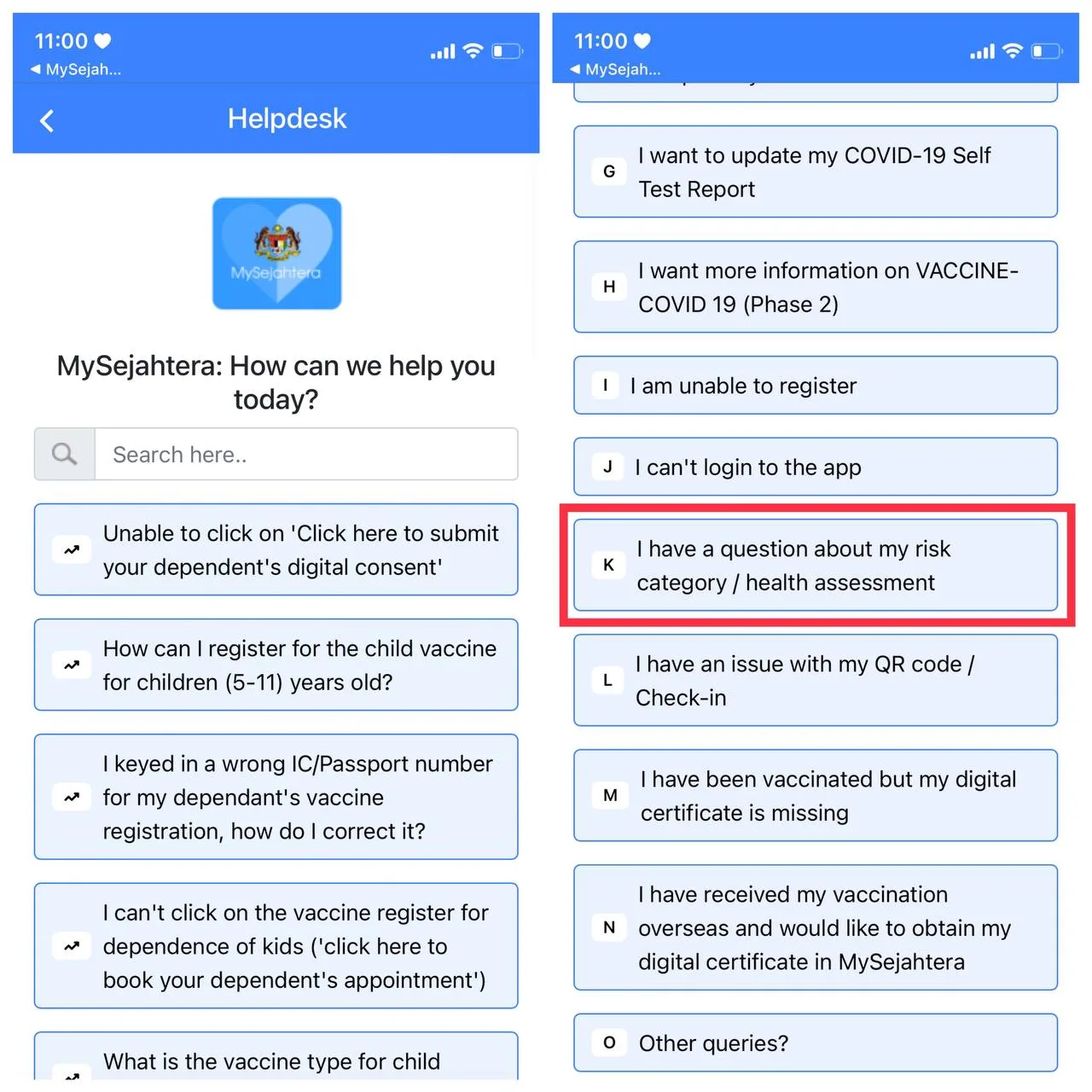 - Scroll down, and select the letter K option of “I have a question about my risk category/health assessment.“