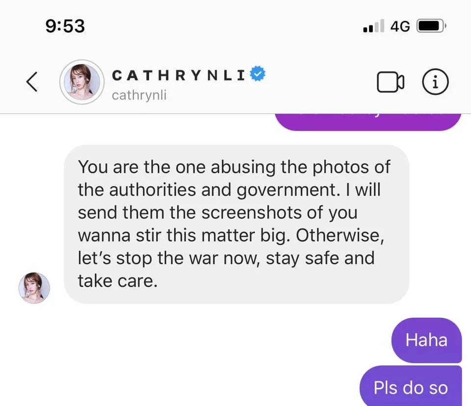One of Cathryn’s Instagram ‘Close Friends’ had apparently taken screenshots of her IG stories and shown it to Carrick. The self-claimed civil servant had taken great offence to this matter and posted a picture of a police report and a bunch of screenshots of their conversations on his Facebook profile, tagging the fitness model on the post.