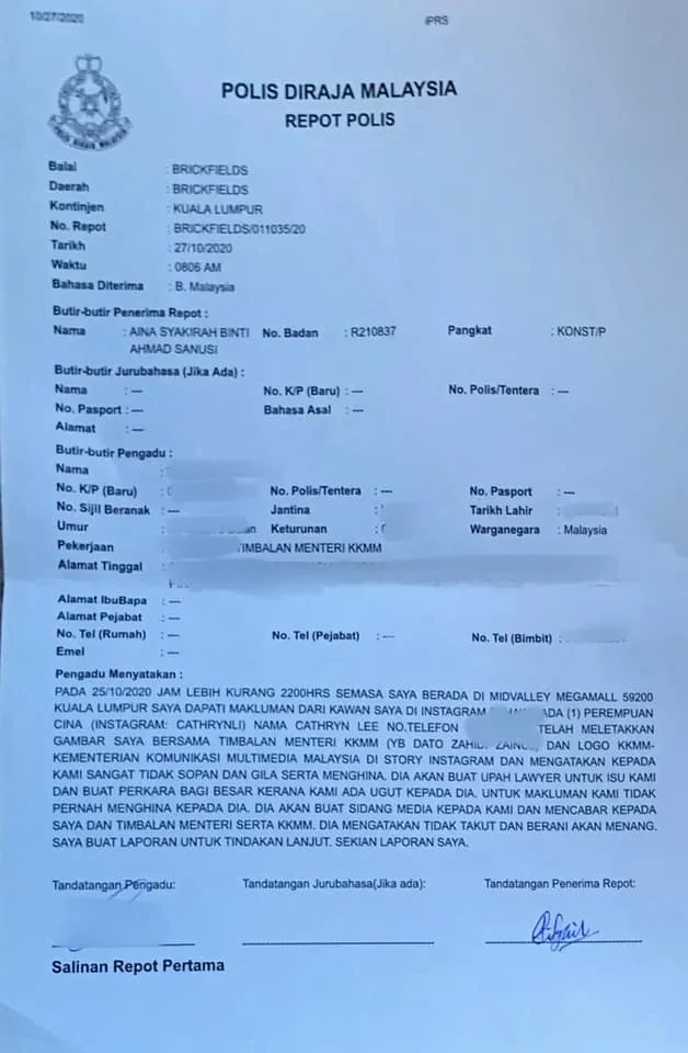 According to China Press, Cathryn Li lodged a police report on 27th October and hired a lawyer to handle the case. Her lawyer contacted MCMC, who then confirmed that the department does not have a civil servant named Carrick Tan working under them. Cathryn also divulged that she had learned that Carrick had harassed many others in the past.