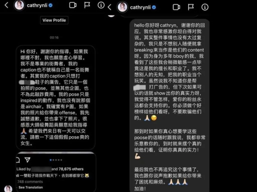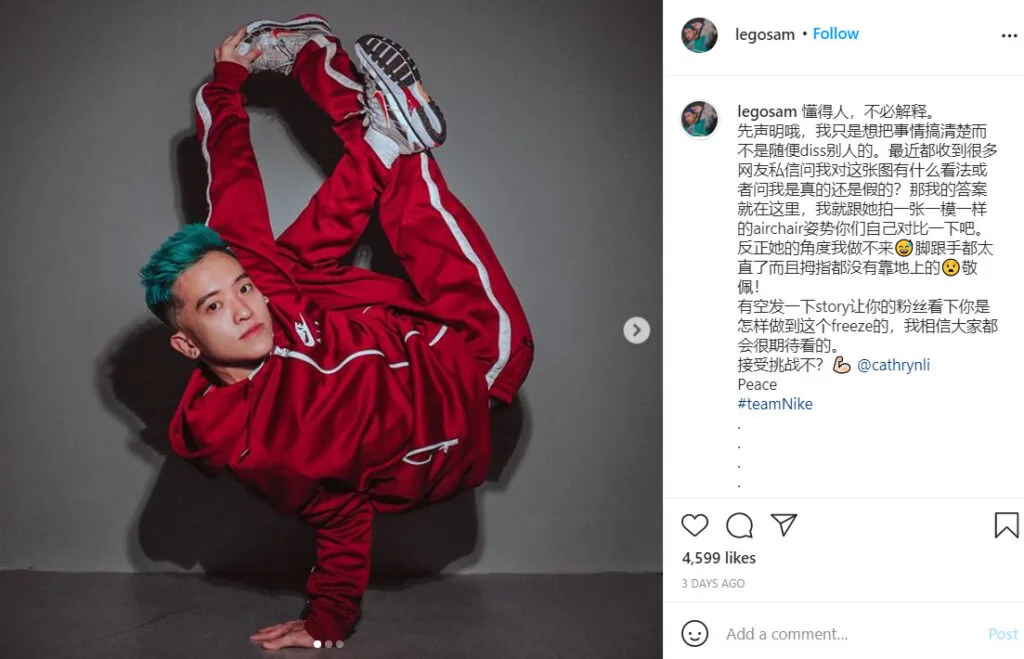 Social media influencer Cathryn Li (李元玲) recently posted a photo of herself doing a breakdancing pose to promote a shoe brand. While it looked impressive, Malaysian breakdancer Sam Jee Lek felt otherwise.