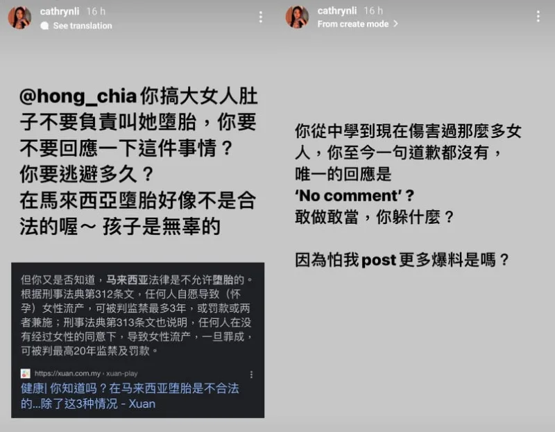 “You got together with a (grown) woman and didn’t take responsibility for her having an abortion,” Cathryn wrote. “Want to respond to this?” She asked him how long he’d been running away from the issue before adding that abortion is illegal in Malaysia. As proof, she added a quote from Chinese media Xuan which shared Article 312 and 313 of the Criminal Code. To summarise, voluntarily causing a woman with a child to miscarry can be punished with 3 years imprisonment or a fine or both. Voluntarily causing a woman with a child to miscarry without her consent can be punished with 20 years imprisonment and a fine.
