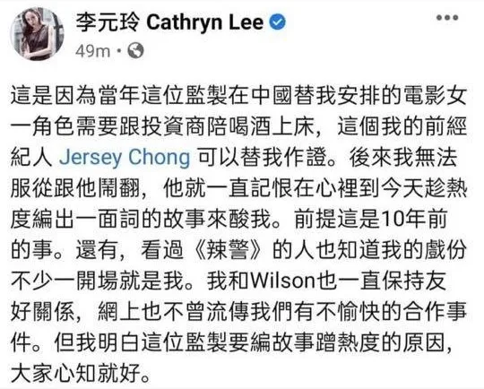 In a more personal post, Cathryn viscously defended herself from Jack’s accusations claiming Jack had arranged for her to accompany investors while they drank and also to bed. She again stated her former agent Jersey Chong would be able to testify for her. As she refused to obey Jack, they had a falling out and he has kept a grudge against her all this while. Cathryn claimed that this was why he came out with his story while the heat was still on her even though it was more than 10 years ago. As for her role in “Special Female Force”, she stated that those who have watched the movie will know she is heavily involved in the film. She affirmed her good relationship with Wilson Chin and stated “no unpleasant cooperation incidents” have been circulated on the Internet. “But. I understand the reason why this producer wants to make (his story) so popular, as everyone knows,” she added.