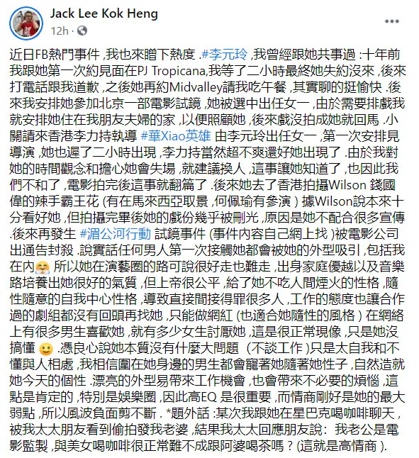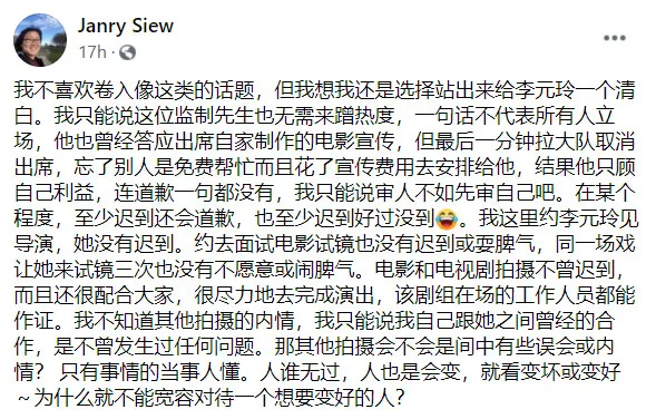 Talent manager Janry Siew however, decided to put her two cents in about the matter to help clear Cathryn’s name. She called the producer out for slandering Cathryn, stating it was unnecessary and that his experiences did not represent everyone’s feelings. Janry then revealed that previously, Jack had “promised to attend the film promotion of his own production, but at the last minute the team canceled the attendance, forgetting that others were (helping for free). He took the publicity expenses and arranged it for him.” She stated he “only cared about his own interests” and didn’t apologise for the slight. “I can only say it is better to judge yourself first,” she said primly. Janry also joked that being late is better than not showing up at all.