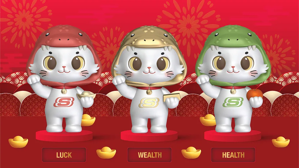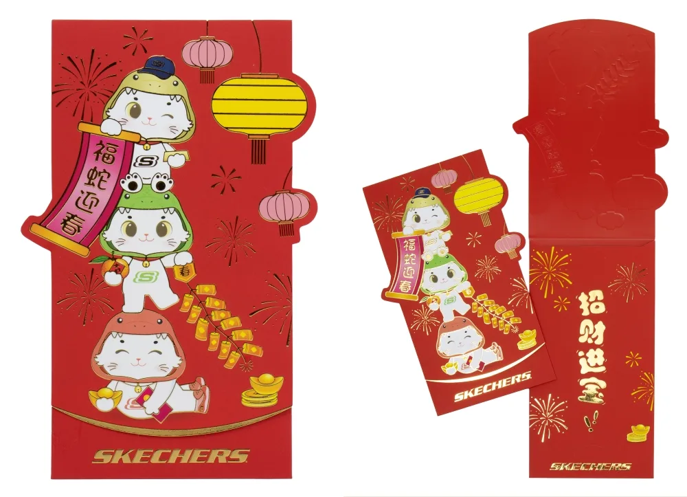 Shoppers spending a minimum of 300nett at selected Skechers store will receive a complimentary* set of six festive red packets – while stocks last. The red packets feature a fun design with three adorable lucky cats wearing snake caps, each holding a symbol of good fortune: one with a gold bar, one with an orange, and the last with a Chinese ingot.