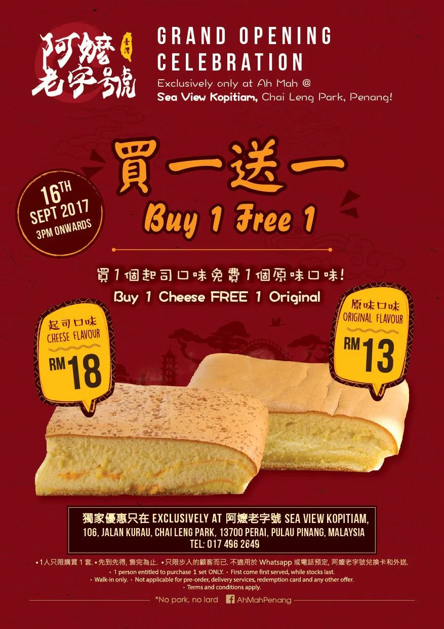 Visiting Penang this weekend? Drop by the newly-opened Ah Mah Sea View Kopitiam branch at Chai Leng Park for the shop’s “Buy 1 Free 1” promo. With every purchase of their cheese flavour cake, patrons will receive an original flavour cake free of charge. The promo is a first come first served bases from 3pm onwards.