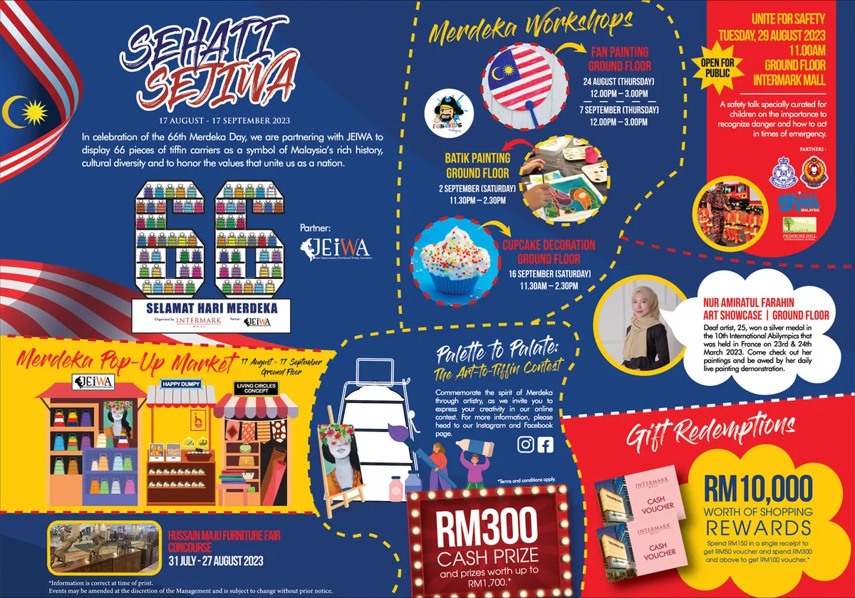 Flex your artistic muscles in the ‘Palette to Palate: The Art to Tiffin’ online contest, an homage to Merdeka’s spirit. Submit your artwork for a chance to have it painted onto a tiffin, and win prizes up to RM1,700 plus a RM300 cash prize. And that’s not all – shoppers can snag cash vouchers worth up to RM10,000 at Intermark Mall by spending above RM150 in a single receipt.