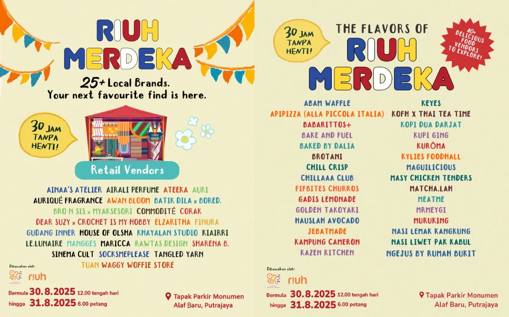 RIUH Merdeka aims to further instill the patriotic spirit and love for Malaysia through arts, culture and creativity. The event is also a platform for local brands and businesses to showcase their work to the public, with more than 80 vendors offering various products. Not only that, but there will also be exciting performances from local stars, including Yuna, Misha Omar and more!
