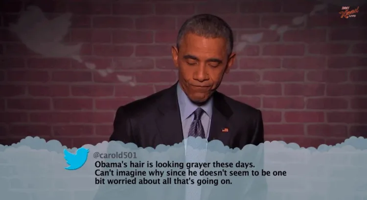 Yes, Barack Obama of the US made his first appearance on the show since he became president. Amongst the mean tweets that he read are such as, “Is there anyway we could fly Obama to some golf course halfway around the world and just leave hime there?” and “How do you make Obama’s eyes light up? Shine a torchlight in his ears.”