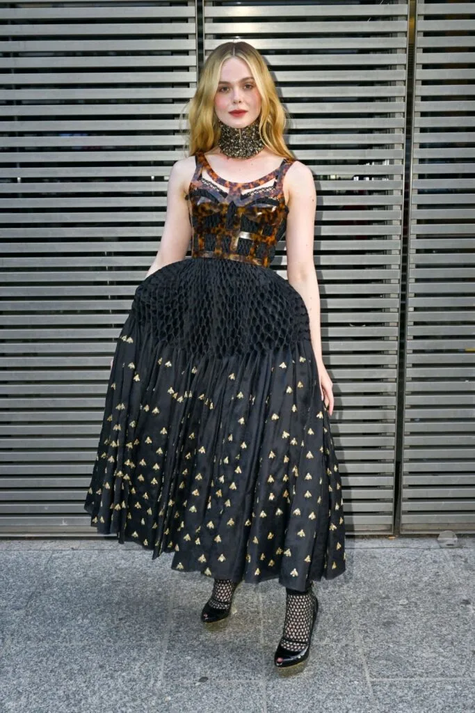 In terms of how she dressed for the Alexander McQueen spring/summer 2024 presentation, Fanning seems to draw inspiration from her role in The Great. She wore a piece from the brand’s bee-inspired spring/summer 2013 collection designed by Sarah Burton.