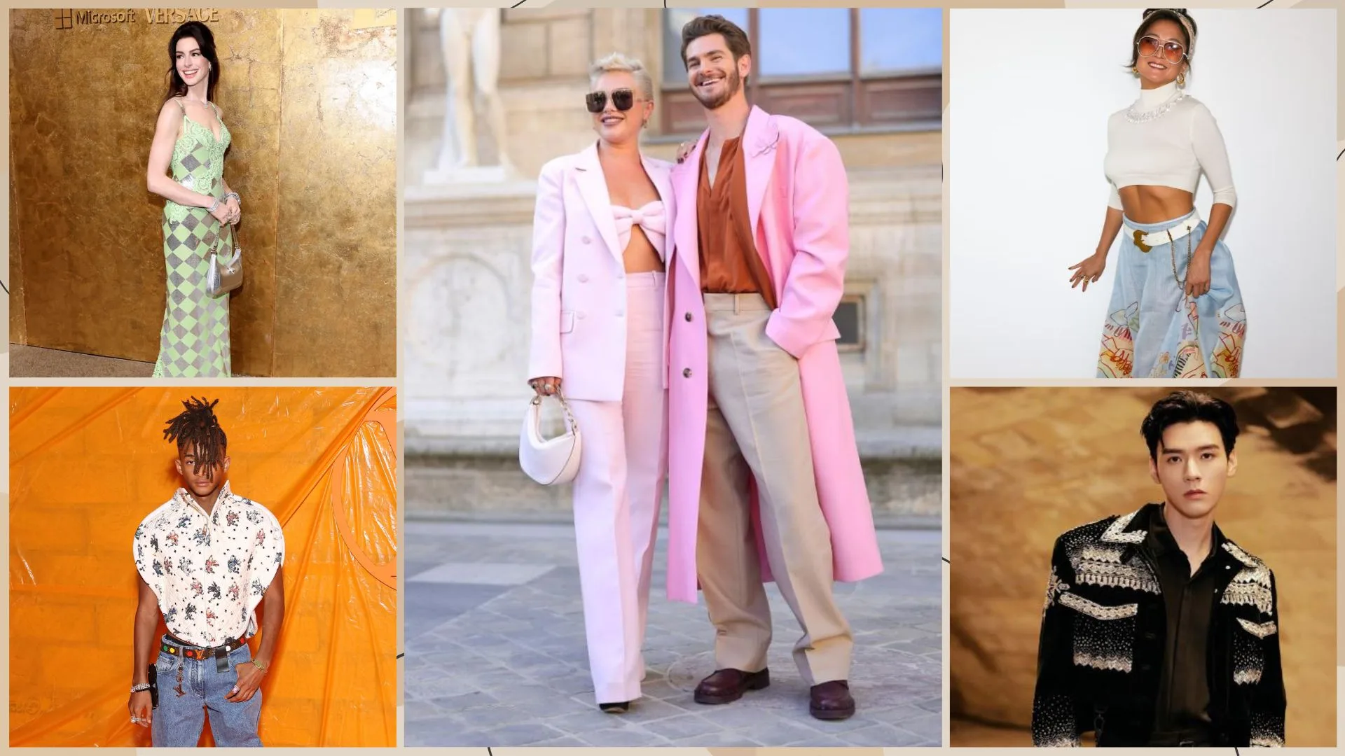 Florence wore a baby pink double-breasted blazer, wide-legged pants and sky-high platforms to Valentino’s spring/summer 2024 runway show in Paris. She also wore a girly bow-shaped bralette underneath. She was accompanied by Andrew Garfield, who sported a cotton candy pink blazer, a burnt orange top and beige trousers.