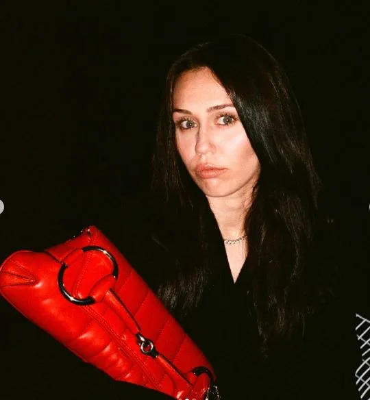 The Hannah Montana star goes from blonde locks to a darker look with her brunette hair transformation. Her fall-ready attire included a cosy black outfit, a vibrant red Gucci handbag, and little makeup.