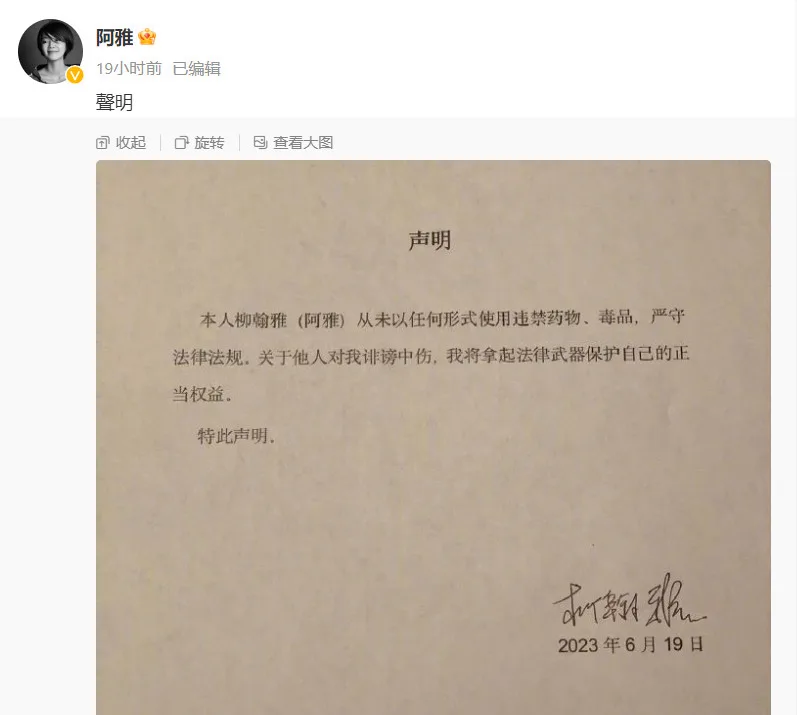 “I, 柳翰雅 (Aya), have never used illegal drugs or drugs in any form, and strictly abide by laws and regulations. Regarding other people’s slander against me, I will take up legal action to protect my legitimate rights and interests.
