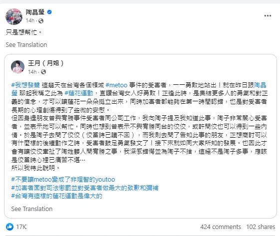However, Matilda’s friend Moon Wang (王月) later came forward to clarify the situation. She claimed they had been speaking about the #MeToo movement in Taiwan when she brought up her contact with one of Chris Wang (宥勝)’s alleged victims. They had hoped to gather more information about the issue, and thought of reaching out to Mickey Huang as he supposedly had refused to stand on the same stage as Chris.