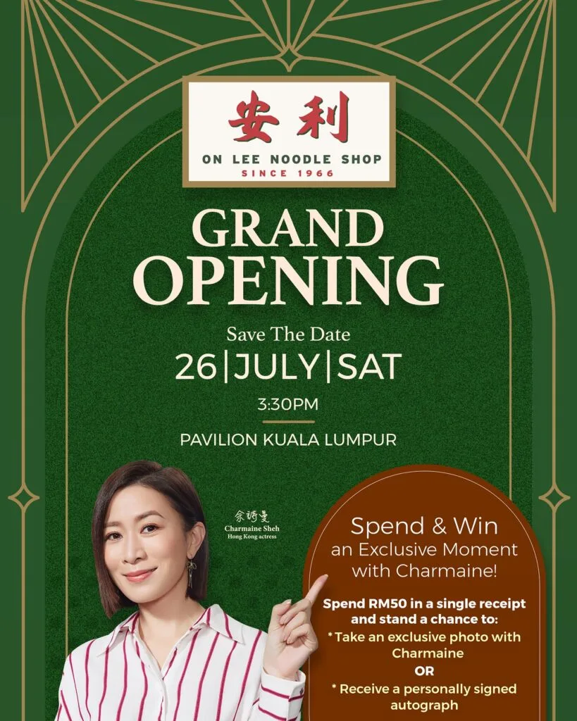 - Contest mechanics: Spend RM50 in a single receipt at On Lee Noodle Shop at Pavilion KL to stand a chance to take a photo with Charmaine Sheh or receive a personally signed photograph
