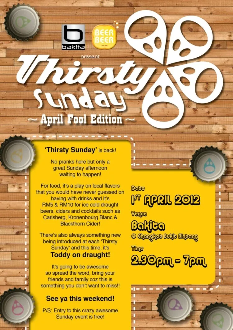 But here’s something that’s neither a joke nor a prank. “Thirsty Sunday” (by Beerbeer) is happening this weekend at the heaviest weight of Sunday in Kuala Lumpur, bakita!
