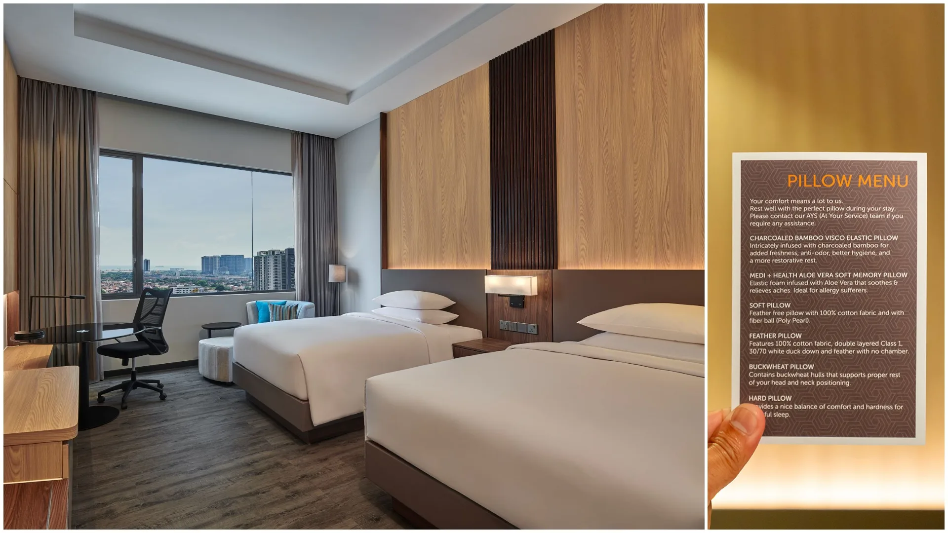 Catch up on your beauty sleep with Courtyard by Marriott Melaka’s Sleep Haven amenities and services. Curated for a restful night, its exclusive pillow menu addresses individual sleep needs, ensuring a stay that rejuvenates the mind and body. Dedicated guest services personnel are available to help you choose from premium pillows like the ‘Medi + Health Aloe Vera Soft Memory Pillow,’ perfect for those who suffer from allergies or prefer eco-conscious support, or the ‘Buckwheat Pillow’ that offers superior support to the body and neck. Elderly guests can enjoy the specially designed ‘Hard Pillow’ – don’t be fooled by the name, as it offers optimal comfort and support.