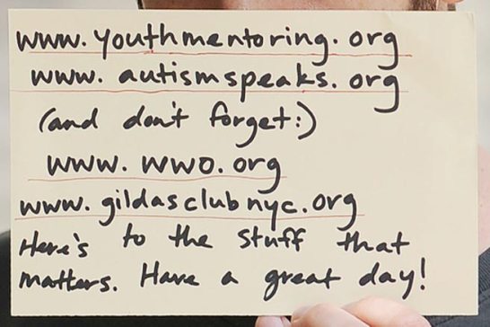 Emma’s read, “Good Morning! We were eating and saw a group of guys with cameras outside. And so we thought, let’s try this again. We don’t need the attention, but these wonderful organizations do,” with an arrow pointing to Andrew, who was holding up a list of websites.