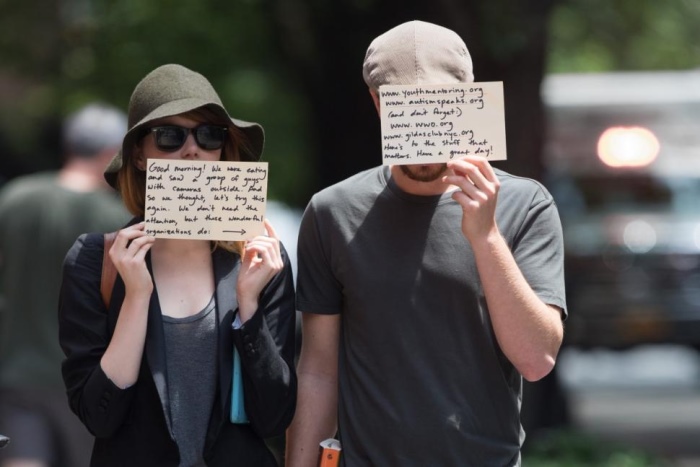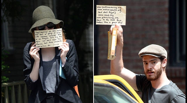 So, on Tuesday, the couple (who have been dating since 2011) strolled around NYC with their faces concealed. Not because they were having a bad hair/bad face day or anything – but because they had signs to hold up. And around they went in Big Apple with signs that bore handwritten messages direction attention to a couple of youth and cancer organisations.