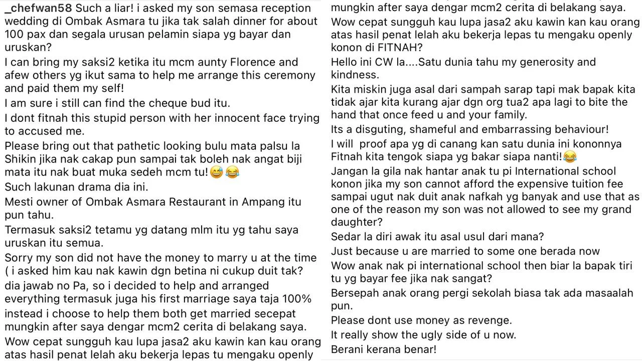 The exposure was done through his personal Instagram account, to which Shikin replied on her Instastory, claiming that it was a false statement and the wedding was 100% paid by her and Chef Riz.