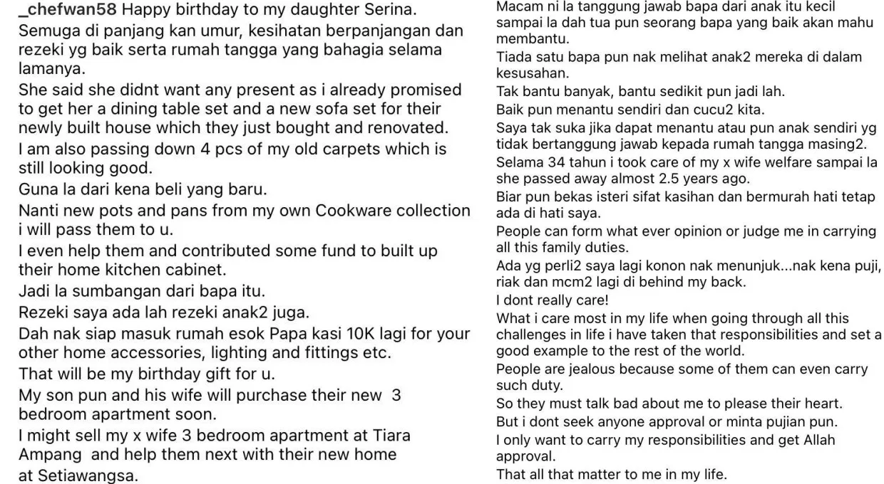 Apart from donating some of his old carpets and kitchenware, Chef Wan said that he also helped by contributing some funds to cover the cost of installing kitchen cabinets at her house. “My ‘rezeki’ (sustenance) belongs to them as well. When the renovation is finally completed, Papa will give another RM10k for your home accessories, lightings, fittings, etc. That will be my birthday gift to you,” Chef Wan wrote in his caption.