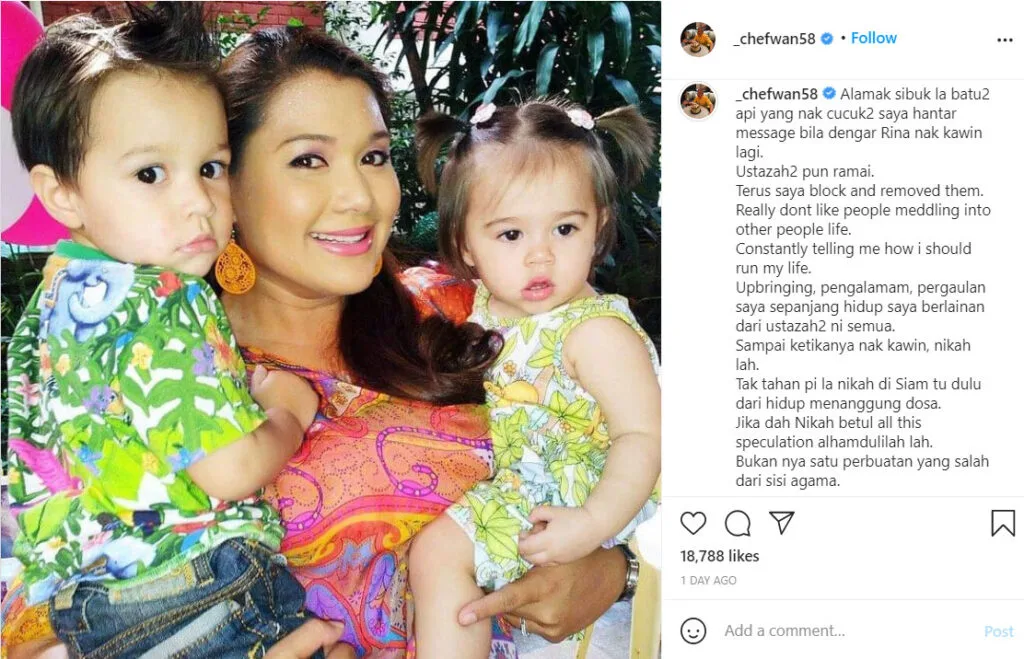 The renown chef took to Instagram on 5th April to express his thoughts. He revealed that his daughter, actress and TV host Serina Redzuawan, had requested to have a simple wedding reception at his home in Cyberjaya after Hari Raya Aidilfitri. The single mother of two had only just informed her father last month that she was seeing someone new.