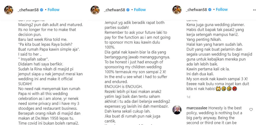 “Let your guests congregate at the mosque and eat at De.Wan 1958 after that,” he wrote. Chef Wan noted that the ongoing pandemic disallowed large gatherings so a smaller party would be better. “Remember to ask your future bridegroom to pay for the (wedding reception) bill as I’m not going to do so anymore just like how I paid for everything during your first marriage,” the irate chef said. “If he’s so eager to get married, let him take responsibility for it,” he tacked on.
