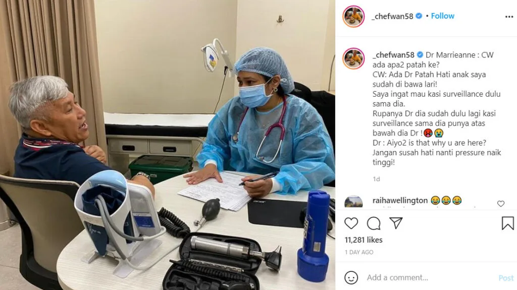 Although Chef Wan was hurt by his daughter’s actions, the celebrity chef still has it in him to joke around. During a visit to the doctor’s, he jokingly asked her to check his heart. The chef claimed he was suffering from a “pained and saddened heart“. He also told the doctor he had a broken heart because “my daughter has been taken away“. The doctor, in good humour, responded with: “Aiyo, aiyo is that why you are here? Don’t be troubled, your (blood) pressure might shoot up!”