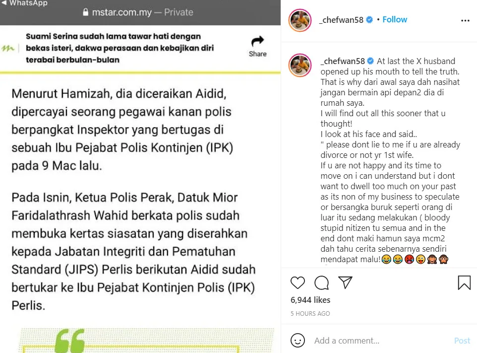 While Chef Wan is thankfully in good health, the same cannot be said for Serina and Aidid’s marriage. Aidid is currently being investigated by the Department of Integrity and Compliance Standards (JIPS) for allegedly marrying a second wife without permission. According to Perak police chief Datuk Mior Faridalathrash Wahid, the case will be handled by JIPS Perlis as Aidid, who is an inspector, had moved to the state in 2019.