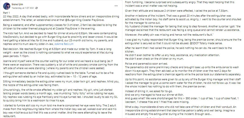 Mrs. Lim had merely wanted to treat her kids after a long week. Her family of four had visited a water themed playground at Coastal Playgrove, along with her parents, sister-in-law and her nephew. They had a good time there before deciding to head to the nearby Burger King for dinner. Unfortunately, that was where things started going wrong.