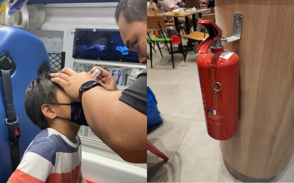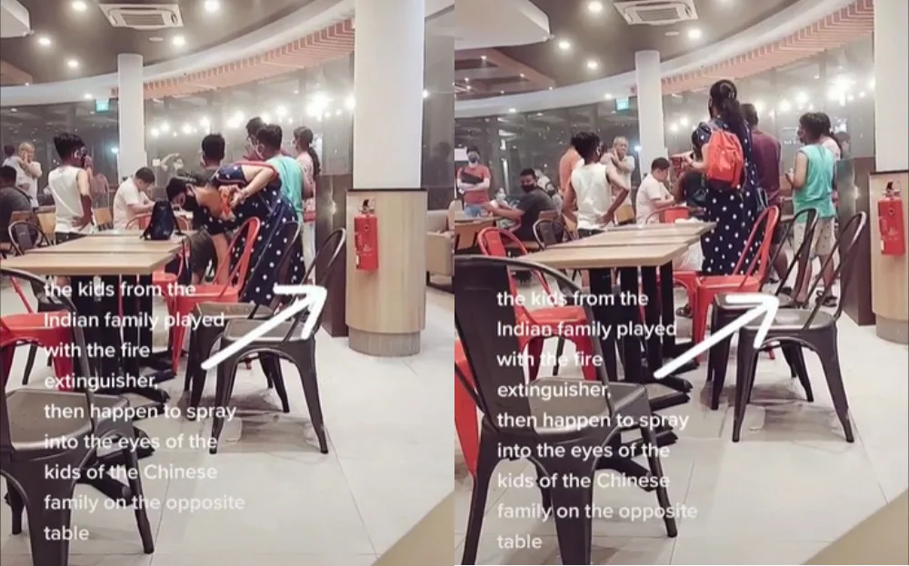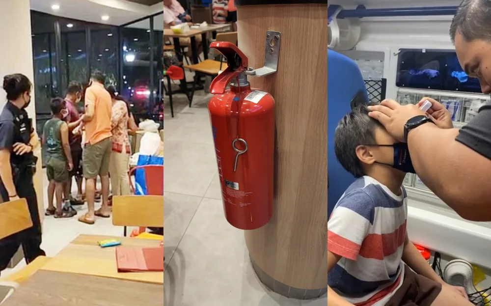 While waiting for their food, Mrs. Lim and her sister-in-law heard a loud bang from where their family was seated. Upon rushing over, Mrs. Lim was shocked to discover that a fire extinguisher had activated, spraying her 23-month-old daughter, nephew and mom. Apparently, a young boy had been playing with the extinguisher prior to the incident.