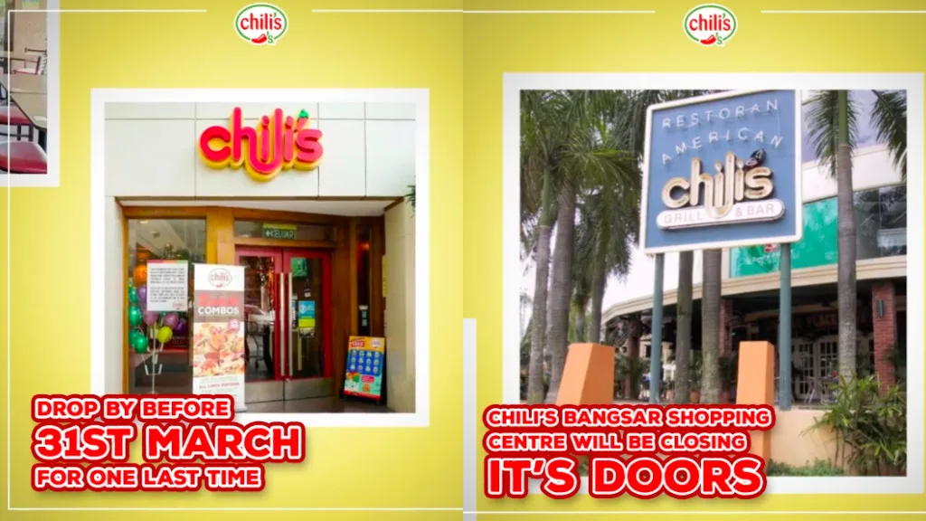 We’re sadly saying goodbye to our very first flagship store. Drop by for one last time before 31st March to say goodbye as we will be permanently closing Chili’s Bangsar Shopping Centre outlet soon.”