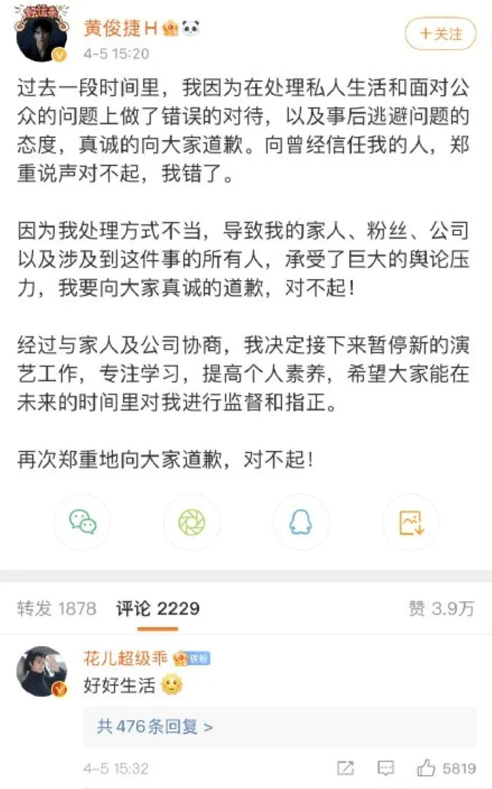 It isn’t always easy for a star to recover from allegations, especially cheating scandals. After 4 months of silence, Chinese actor Huang Junjie (黄俊捷) has finally made a public apology.
