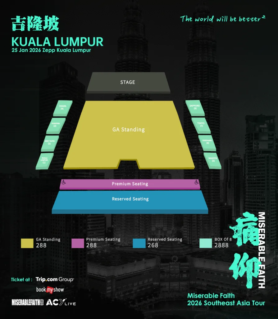 - Ticket Prices: GA Standing: RM288, Premium Standing: RM288, Reserved Seating: RM268, Box of 8: RM2,888