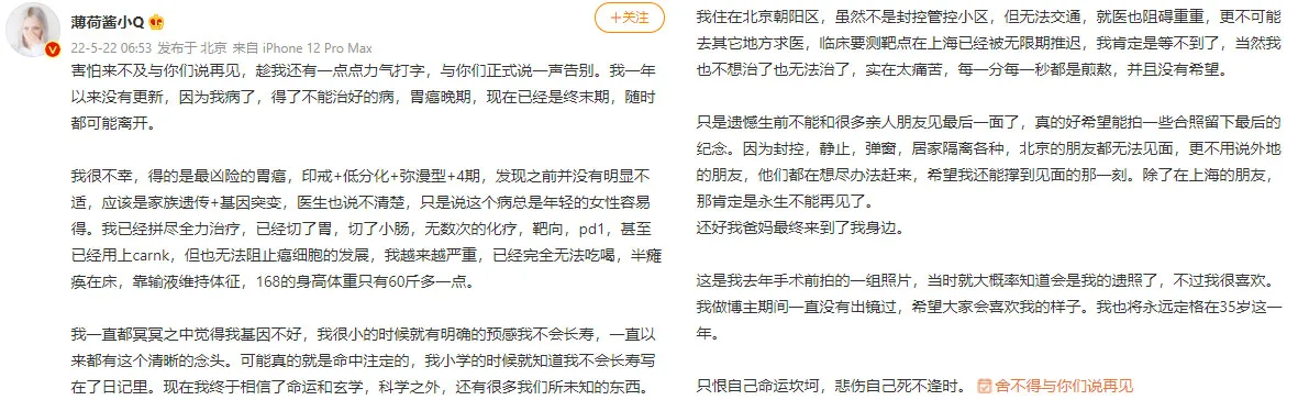 To make matters worse, Mint, who is staying in Chaoyang District in Beijing, has difficulties getting access to medical treatments. According to her, it’s difficult to get transportation, and hard to seek treatment elsewhere. “The clinical target test has been postponed indefinitely in Shanghai,” she admitted. “I definitely can’t wait.” Mint shared that she has no hope of it being cured.